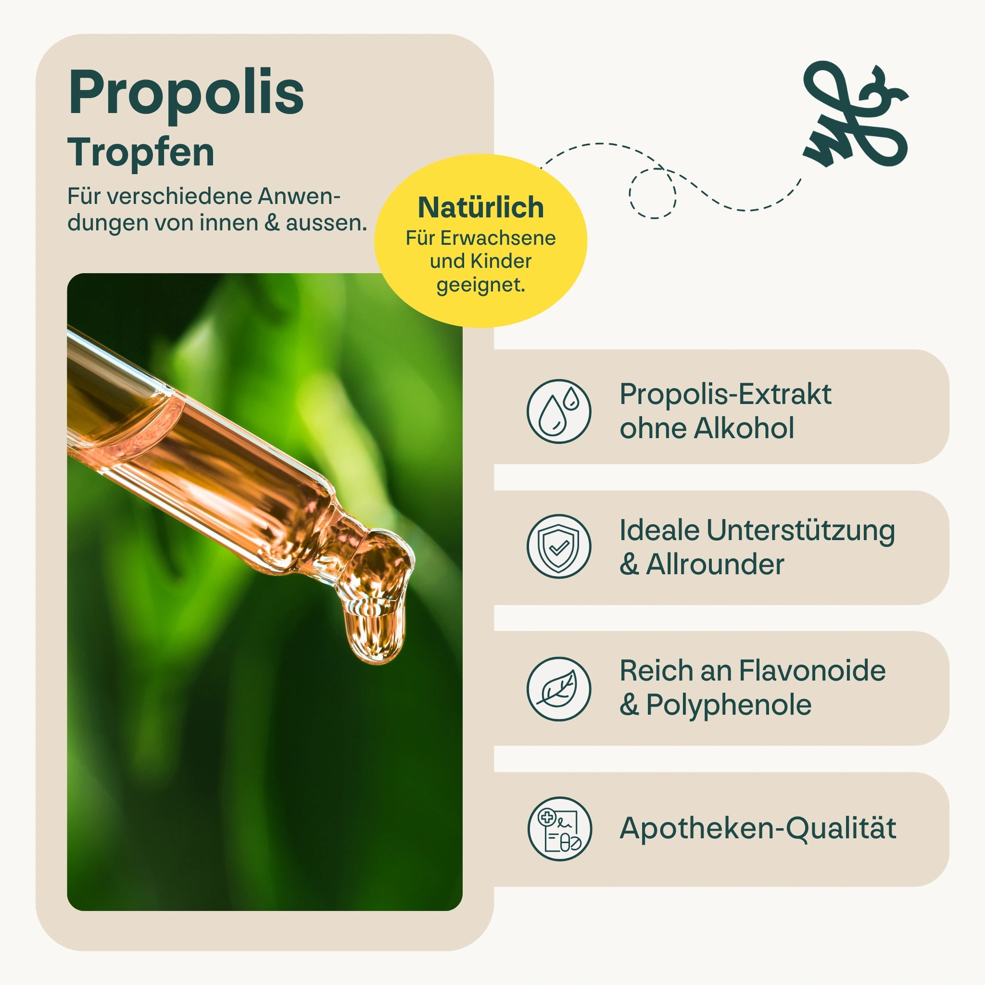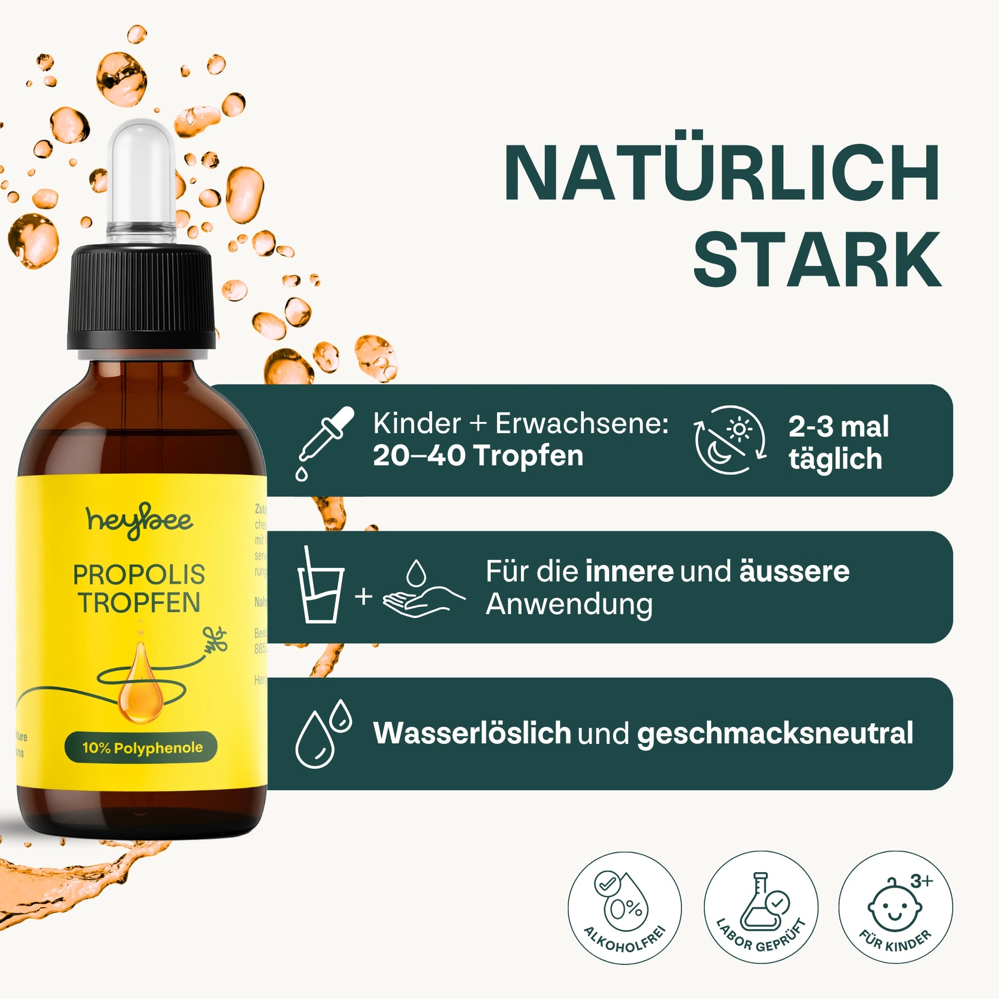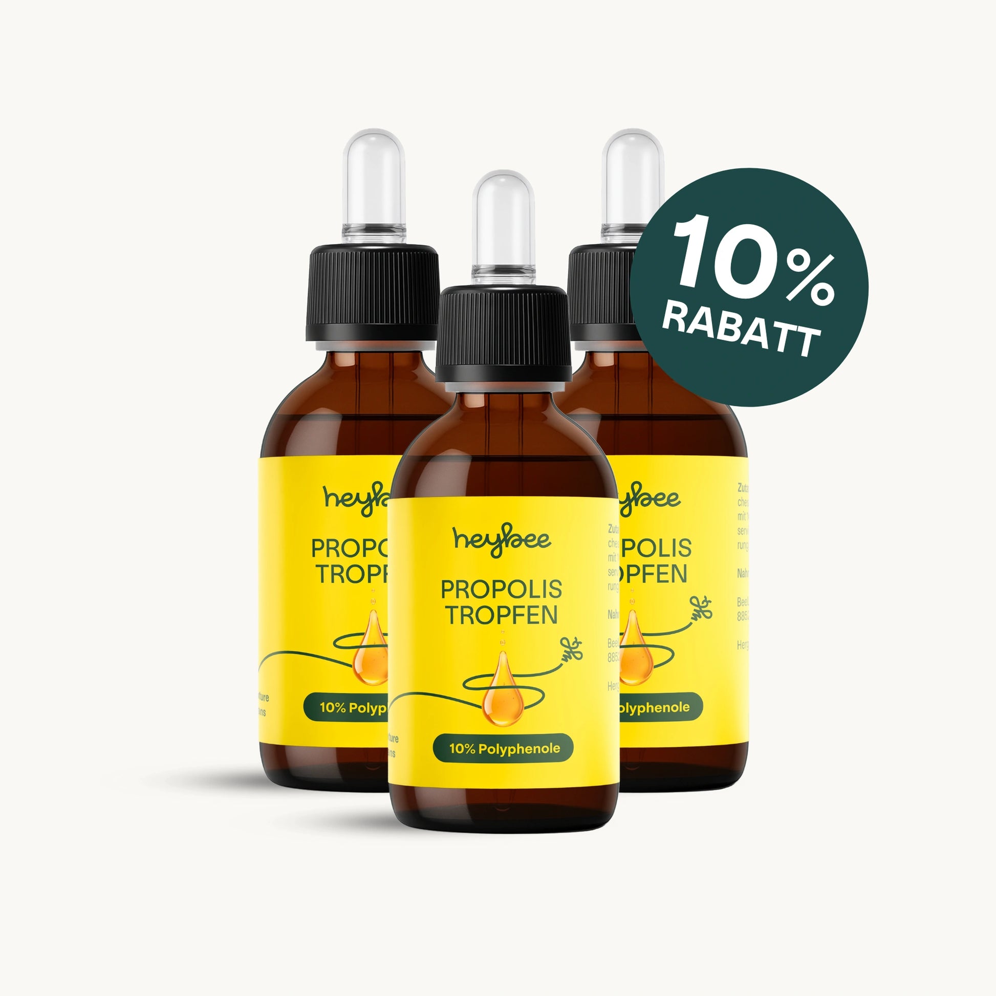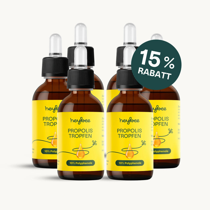 Die heybee Propolis Tropfen bieten dir ein hochwertiges Propolis-Extrakt mit 10% Polyphenolen – das macht sie besonders rein und wirkungsvoll in der Anwendung.