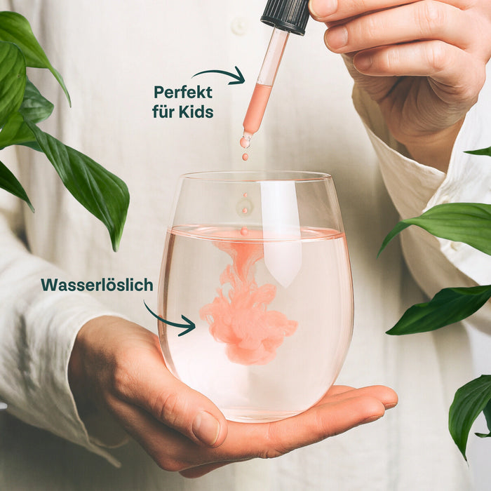 Die Tropfen sind alkoholfrei, wasserlöslich und geschmacksneutral, dadurch besonders angenehm einzunehmen – auch für Kinder. Du kannst sie einfach in Wasser, Saft oder Tee geben, direkt in den Mund tropfen oder – für die äußere Anwendung – punktuell auf die Haut auftragen.